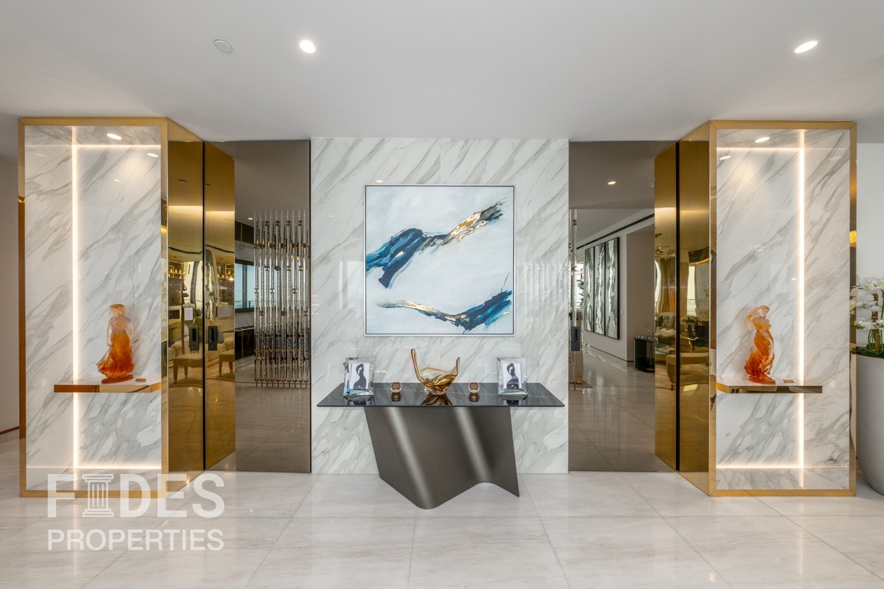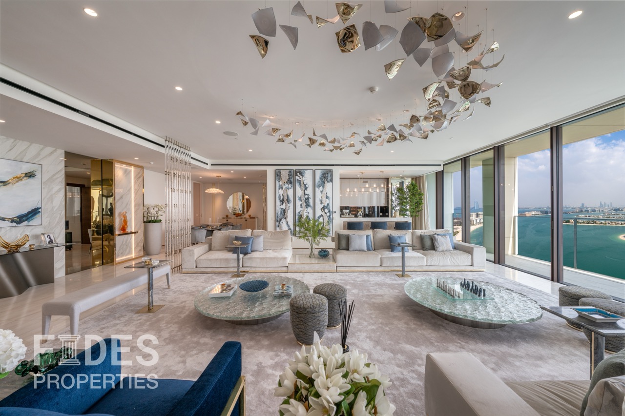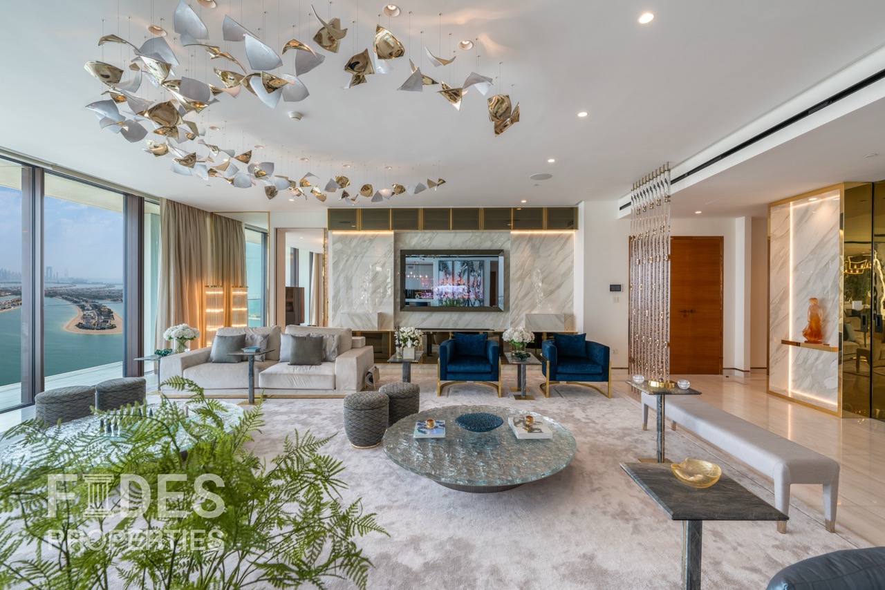 - The Grand Living Area: A vast, open-plan space perfect for both grand entertaining and quiet relaxation. Floor-to-ceiling panoramic windows flood the room with natural light and frame breathtaking, infinite views of the Arabian Gulf, the Palm Jumeirah, and the glittering Dubai skyline. The living room is anchored by a stunning, custom-designed sculptural light fixture—a piece of art itself.