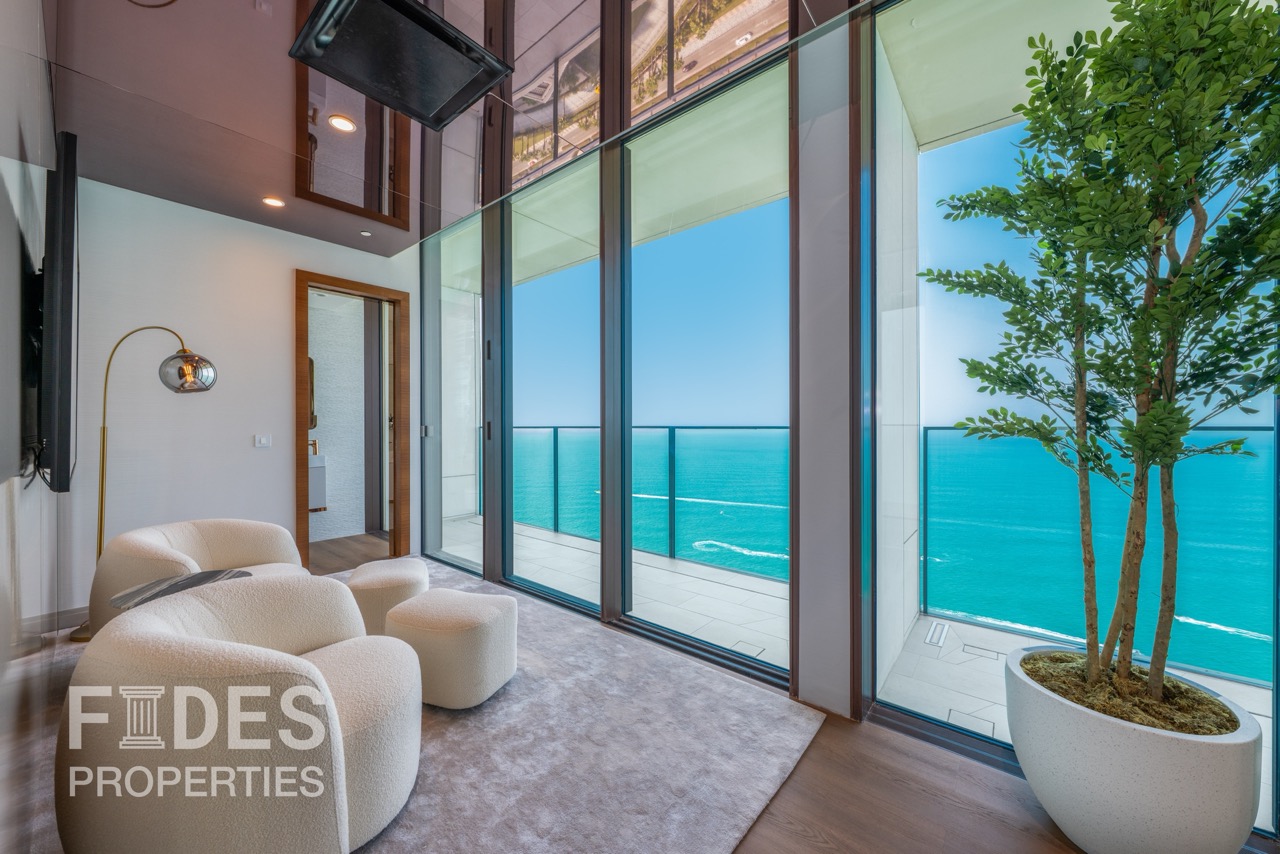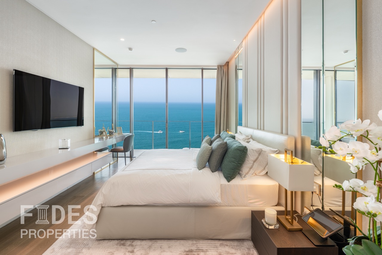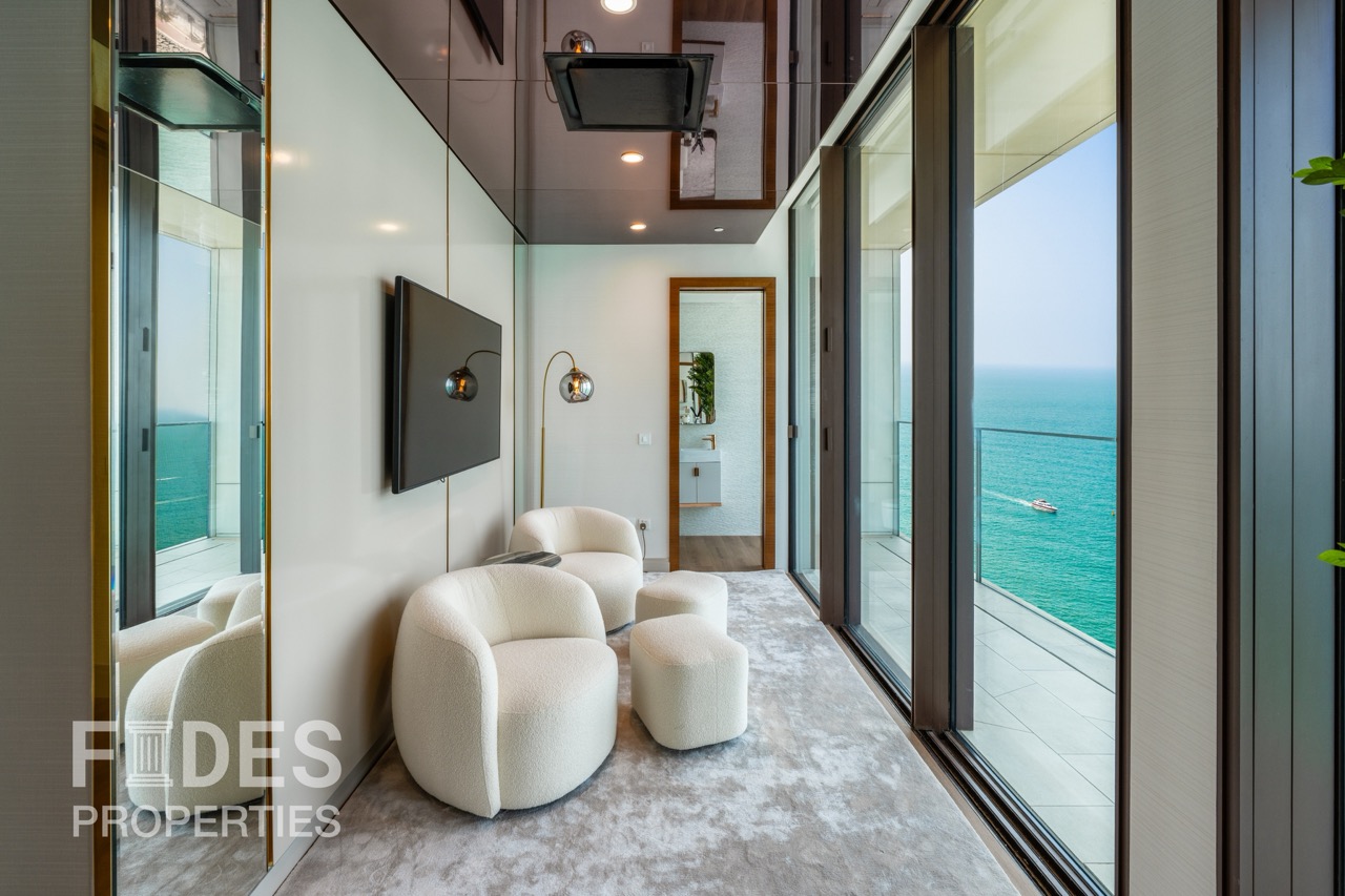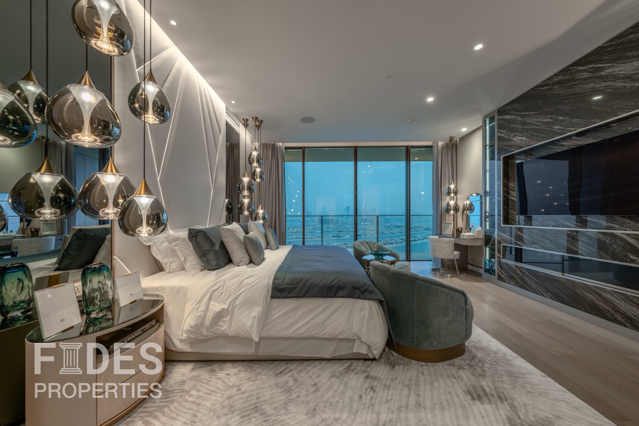 - The Grand Living Area: A vast, open-plan space perfect for both grand entertaining and quiet relaxation. Floor-to-ceiling panoramic windows flood the room with natural light and frame breathtaking, infinite views of the Arabian Gulf, the Palm Jumeirah, and the glittering Dubai skyline. The living room is anchored by a stunning, custom-designed sculptural light fixture—a piece of art itself.